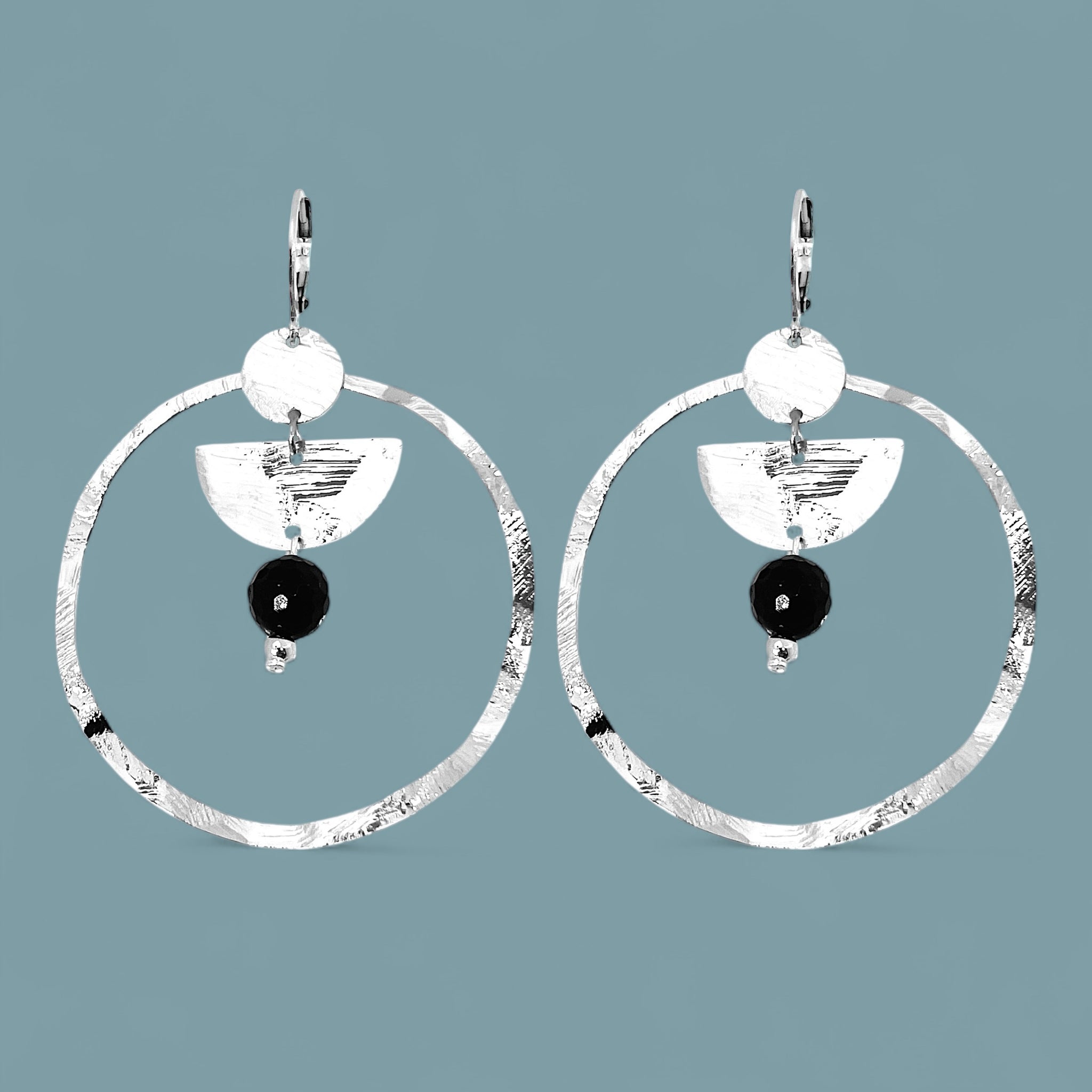 Avec une hauteur de 6,3 cm et une largeur de 4,5 cm, ces boucles d'oreilles rondes s'accordent parfaitement à un bracelet ou un collier pour créer un ensemble harmonieux. Grâce à leur finition en laiton martelé plaqué argent 0,5 micron, elles sont à la fois raffinées et robustes. Les attaches en acier inoxydable garantissent un confort optimal tout au long de la journée. Ces bijoux argentés offrent une touche de sophistication grâce à leurs pierres naturelles et leurs formes rondes.