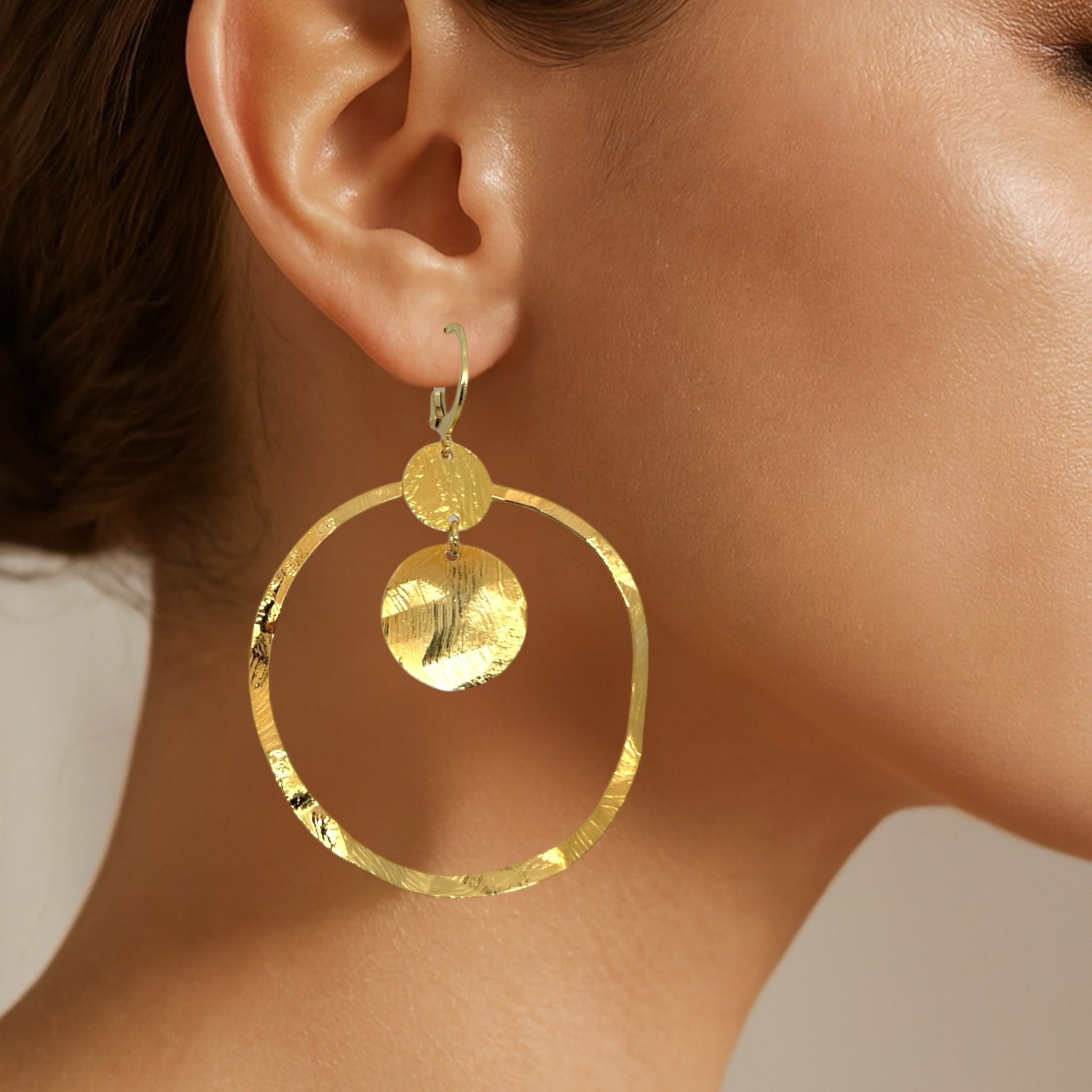 Découvrez les boucles d'oreilles dorées Granada, un bijou intemporel qui saura rehausser chaque tenue avec élégance. Conçues pour les femmes qui recherchent des pièces uniques et de jolis bijoux de qualité, ces créoles en laiton doré allient style et sophistication. Fabriquées en laiton martelé doré à l'or fin avec des attaches en acier inoxydable hypoallergéniques, elles vous offrent à la fois élégance et confort.