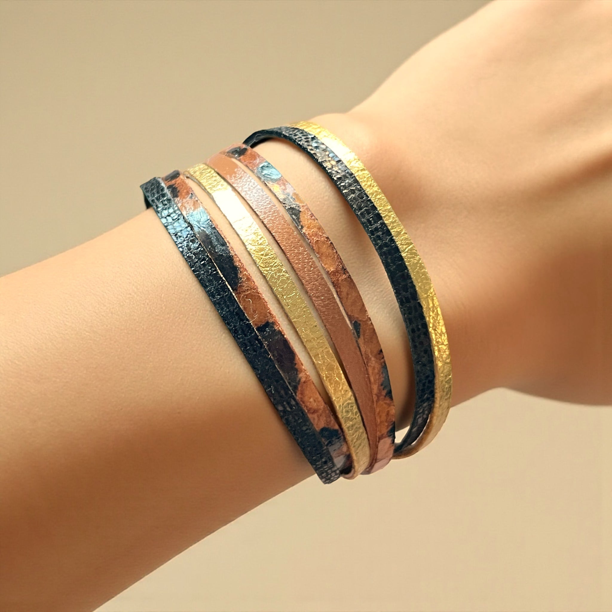 Elégant, léger et facile à mettre, Solis est un bracelet multi-liens en cuirs haut de gamme colorés, au design tout en finesse. Son fermoir magnétique assure un ajustement parfait en un clic. Il est fabriqué à la main avec des cuirs recyclés.