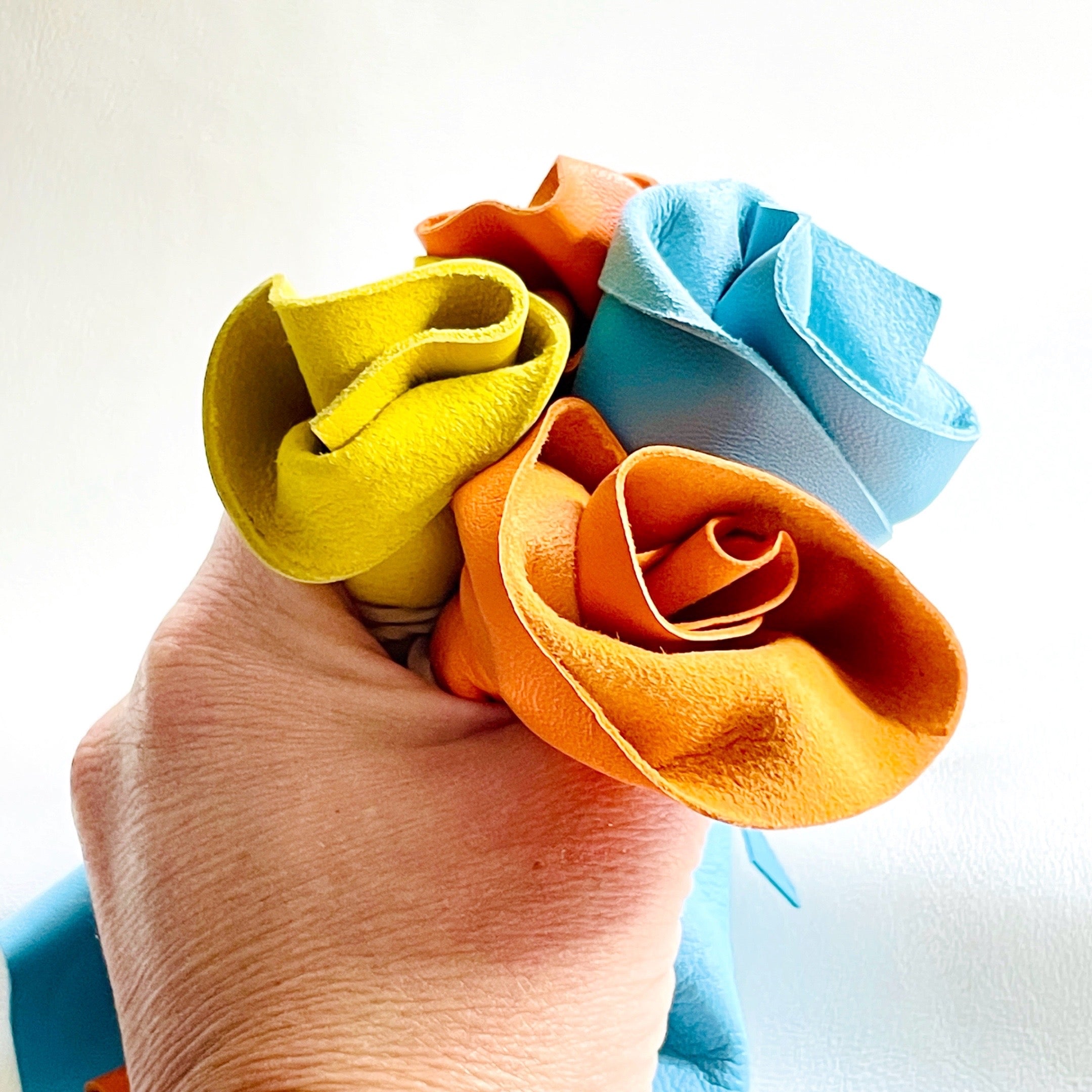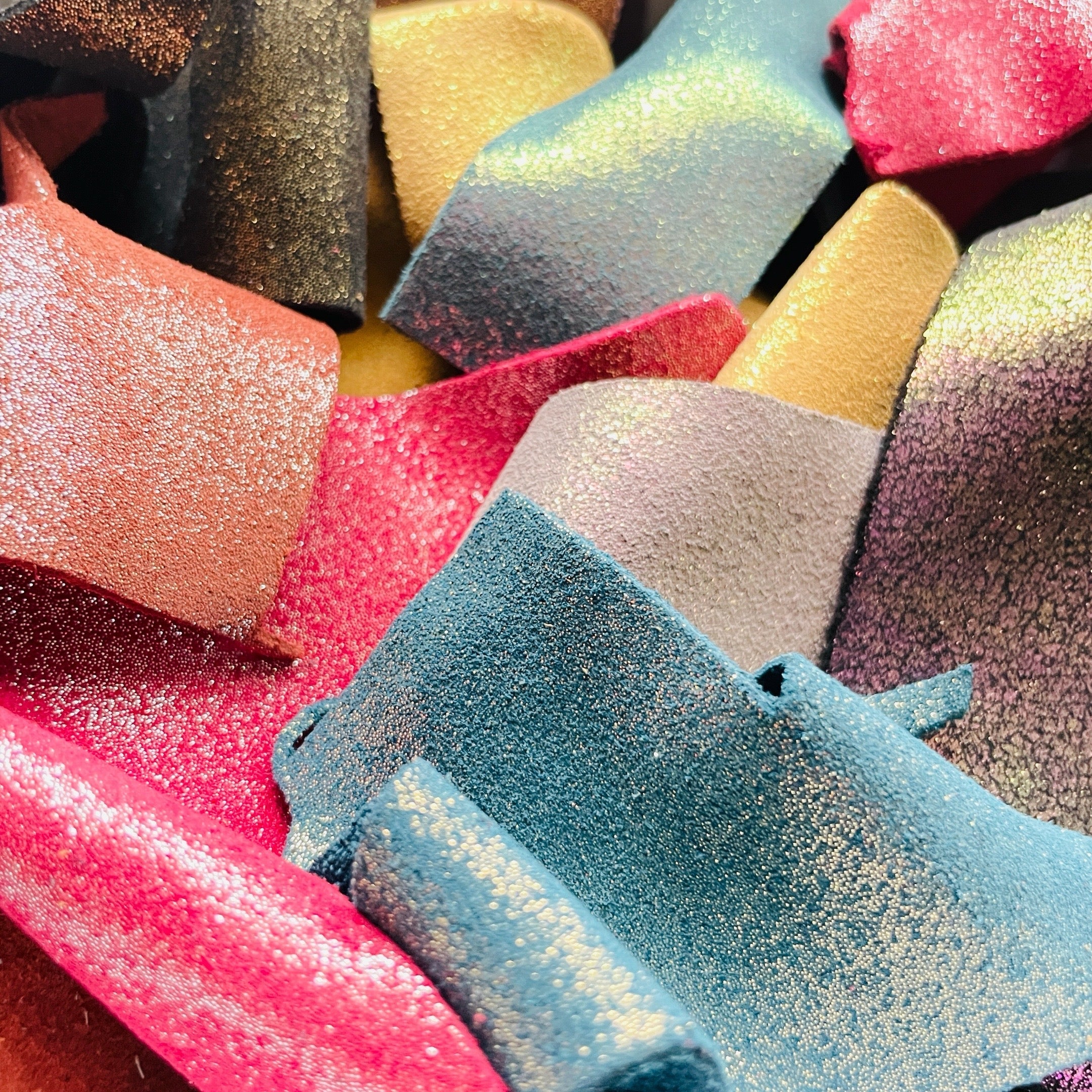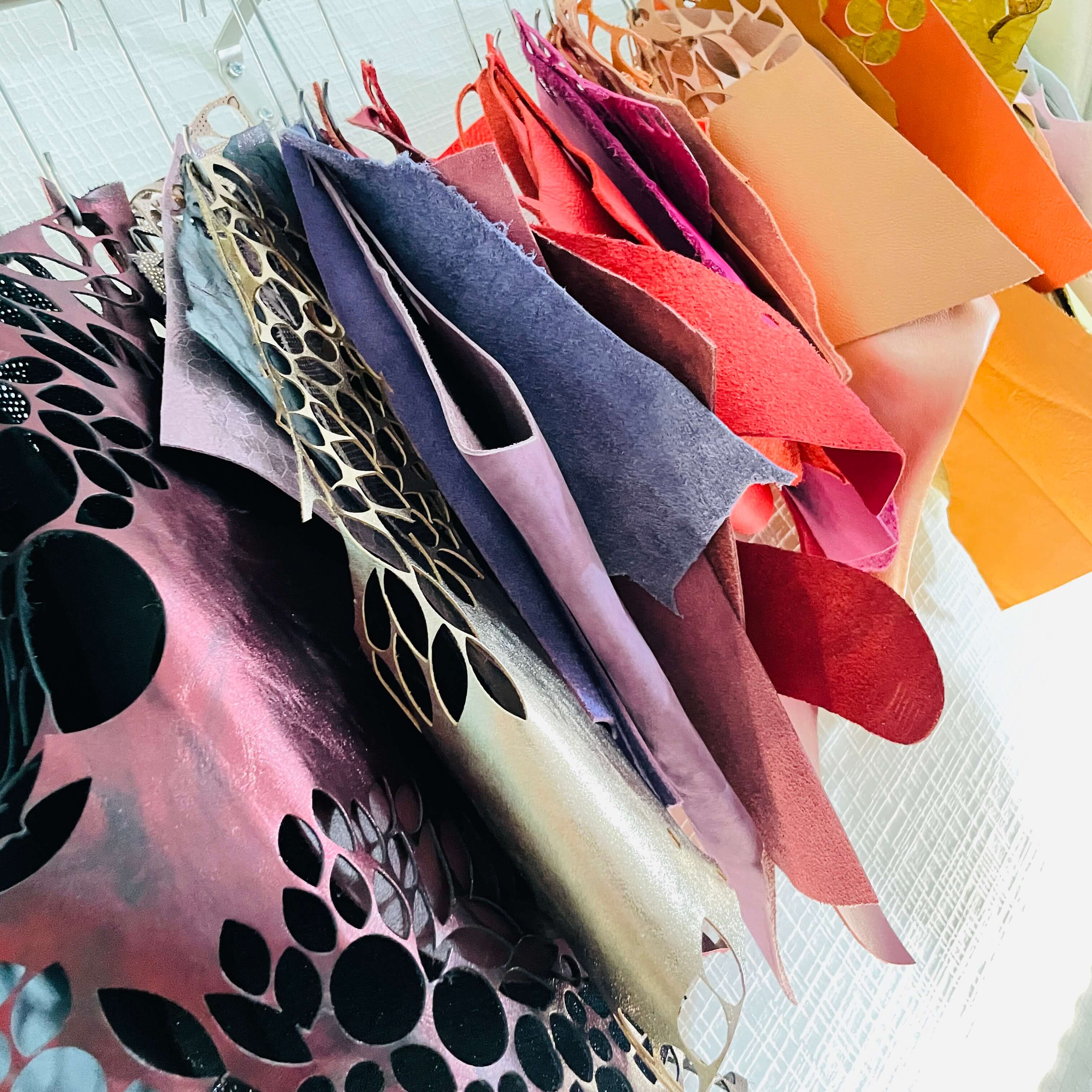 Nos cuirs sont issus du recyclage : ce sont des chutes et excédents de l’industrie du luxe, de tanneries européennes (françaises, italiennes ou espagnoles), ou de maroquineries partenaires.
