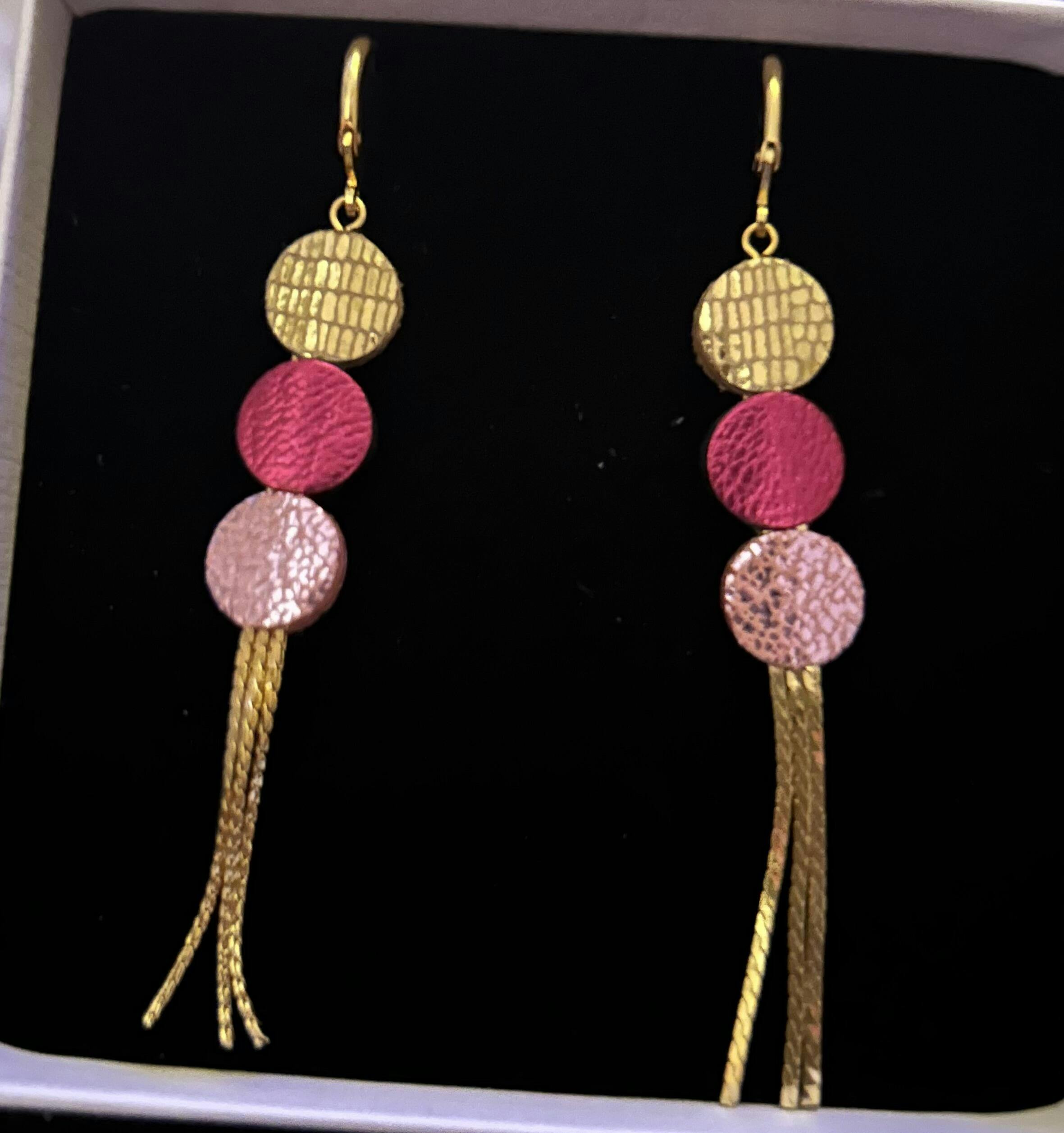 Longues et fines boucles d'oreilles à franges dorées avec 3 petits disques de cuir recyclé. Fabriquées à la main. Elles se déclinent en de multiples teintes, selon vos envies ! Chaque pièce est unique, fabriquée pour vous à la commande, selon vos choix de couleurs.